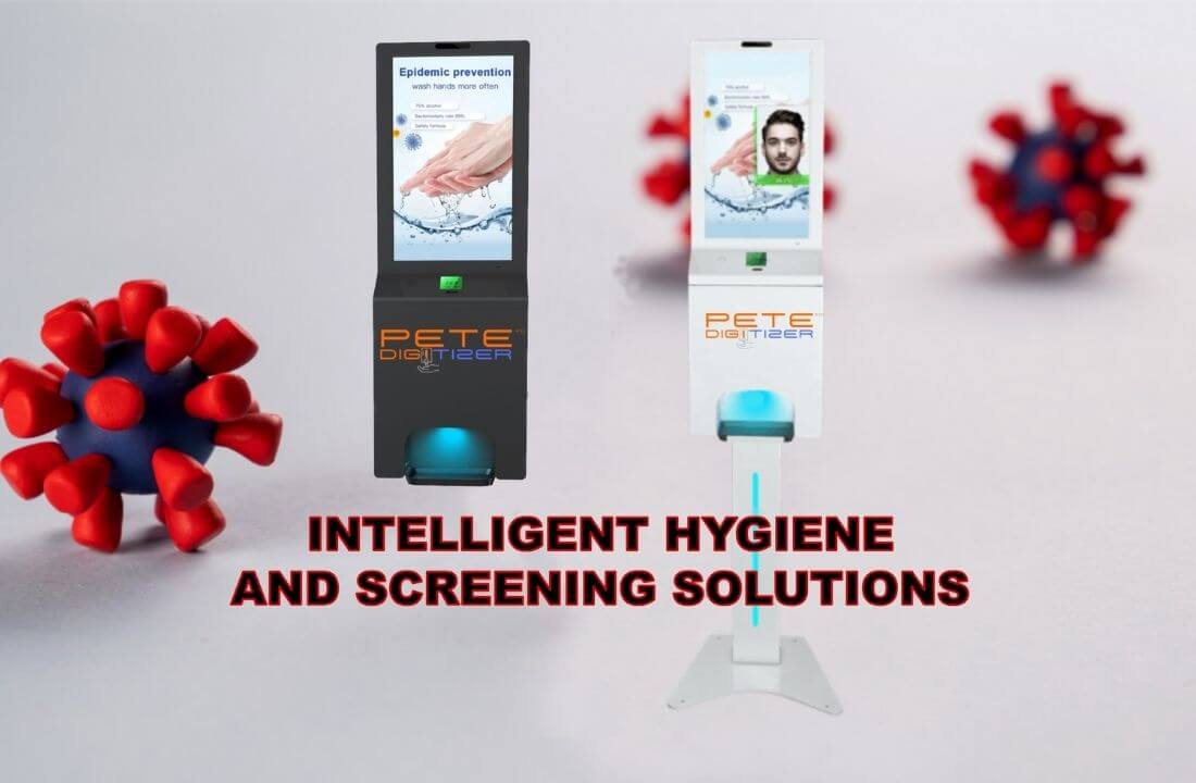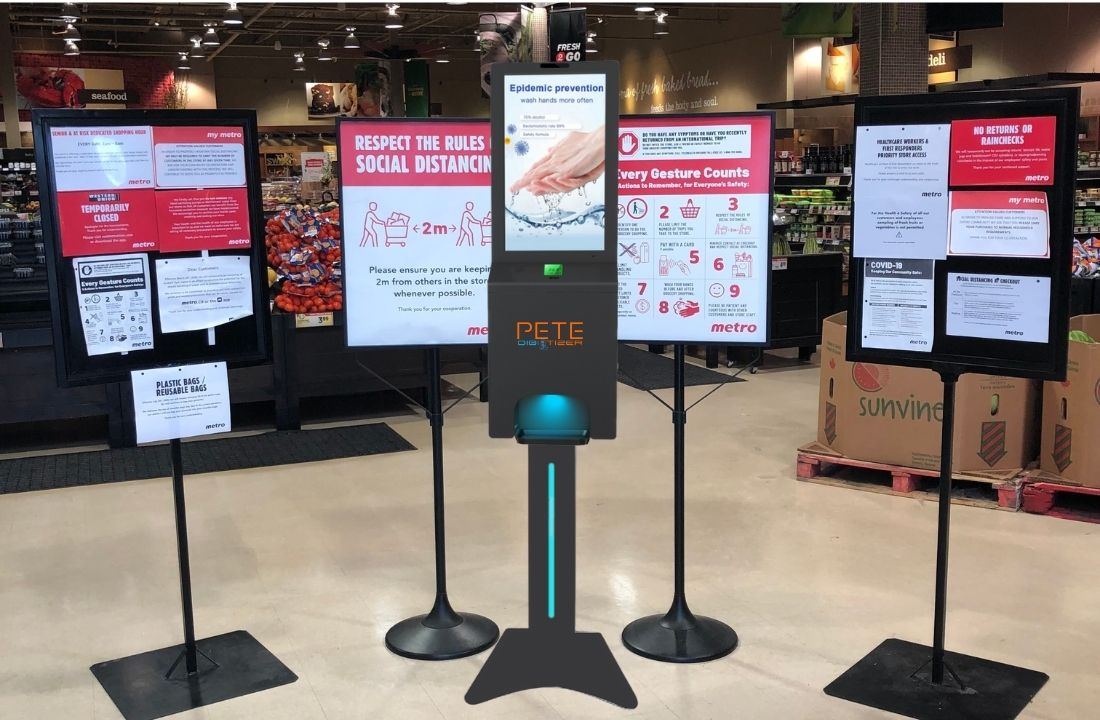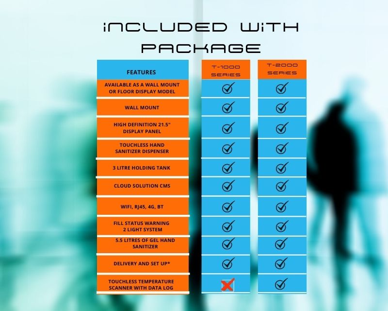 WIFI & 4G equipped, both series available as a Wall Mount or a Floor Display, CMS software allows for scheduling multimedia remotely, 3-litre sanitizer tank, and low-level warning systems.