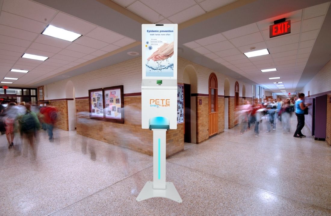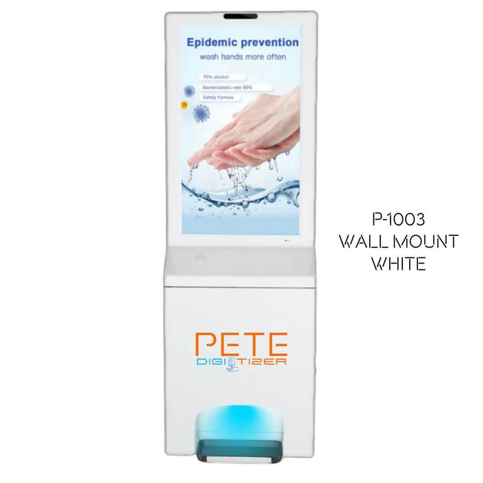All metal construction, integrated HD Display Panel, intuitive touchless hand sanitizer dispensing, and cloud-based content management system are ideal for any space where groups congregate. (Showing P-1003)