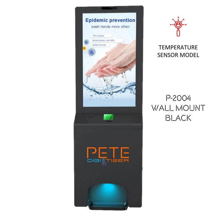 This model includes a touchless temperature sensor with a history log and an audible warning system. Metal construction, integrated HD display panel, intuitive touchless hand sanitizer dispensing, and cloud-based content management system are ideal for any space where groups congregate. (Showing P-2004)